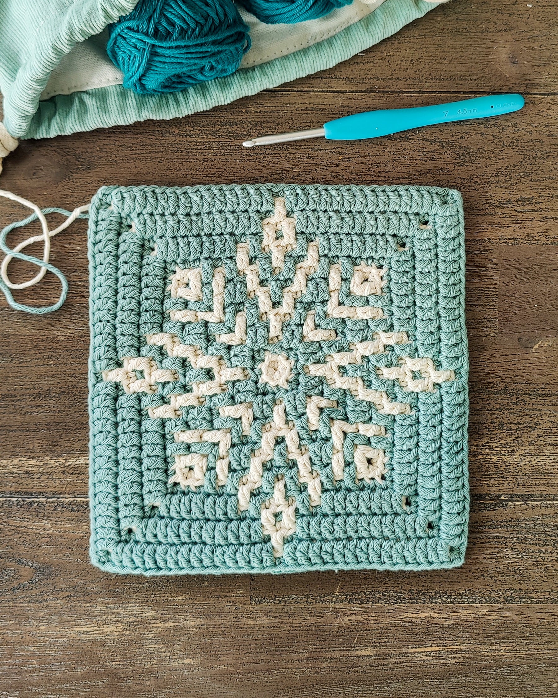 Het Ice Blossom Mozaïek Vierkant is een prachtig haakproject waarbij je vanuit het midden werkt met de overlay mozaïek techniek. Door steken over eerdere toeren heen te haken ontstaat er een mooi reliëfeffect en een verfijnd ijsbloemmotief dat toer voor toer tot leven komt.
